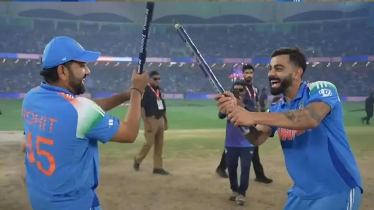 Rohit Sharma and Virat Kohli celebrating a victory with dandiya-style bat dance.